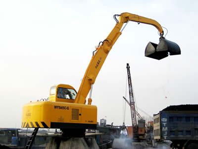 WYS42C-G型電動液壓固定式疊臂抓料機(jī)的回轉(zhuǎn)、卷揚(yáng)、變幅及抓斗開閉作業(yè)等全部采用電動液壓驅(qū)動,先導(dǎo)控制。具有作業(yè)平穩(wěn)、各動作可無級調(diào)速;同等作業(yè)效率下可比內(nèi)燃機(jī)驅(qū)動節(jié)省60%能耗;司機(jī)室安裝冷暖兩用空調(diào)、多向調(diào)節(jié)座椅,作業(yè)環(huán)境舒適;配裝不同的液壓抓斗后均有自重小、抓取力大,對沙石、煤等散裝原料進(jìn)行抓取作業(yè)。